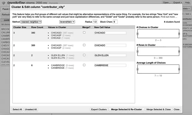 OpenRefine identifies similar items in a dataset and groups them together. It makes it easy to clear up alternate names, correct spellings or even identify trends.