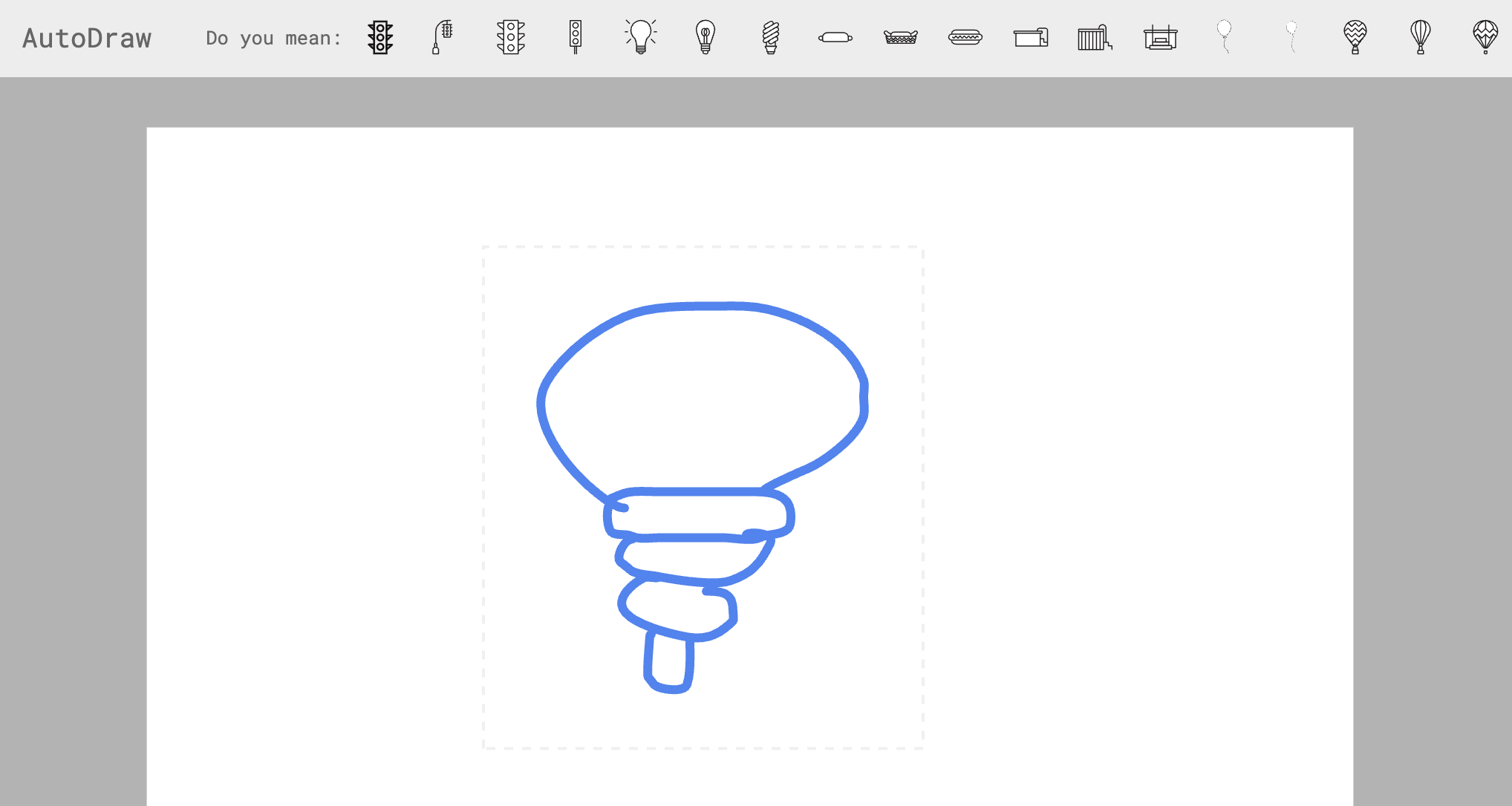 First, you sort of play a game of Pictionary with AutoDraw. It guesses what you are trying to make, then gives you a royalty-free version of it. As you can see, it thought my lightbulb was anything from a stoplight to a hot air balloon.